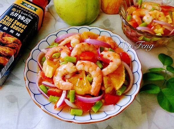把鮮蝦燙熟剝殼,加入一些水果及蔬菜,淋拌泰式甜辣醬汁,酸酸甜甜,微辣風味,非常清爽開胃,當沙拉前菜或主菜都很棒!